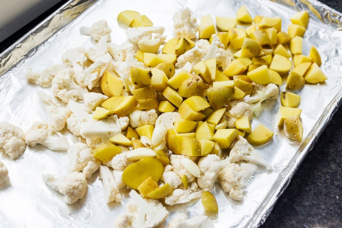 3. Spread oil coated potatoes, cauliflower and garlic in an even layer on baking sheet and roast until golden brown, about 35-45 minutes, stirring once halfway through.