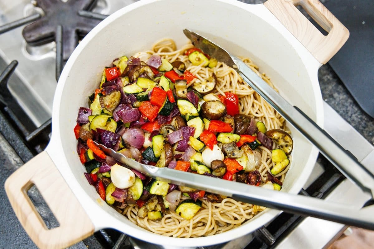 - While vegetables are roasting, prepare pasta according to package instructions reserving 1/2 cup starchy cooking liquid. Strain pasta then return to the warm cooking pot.8 ounces whole wheat spaghetti