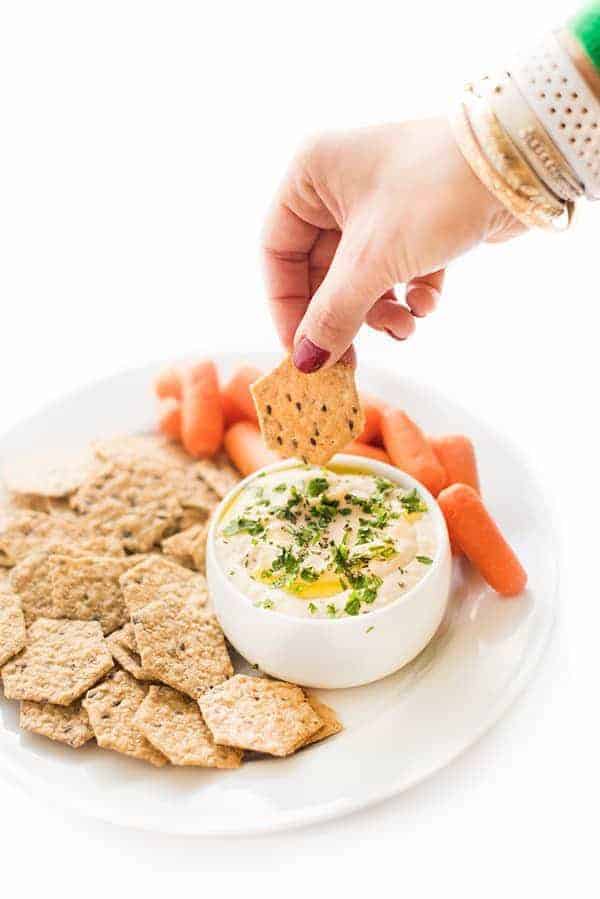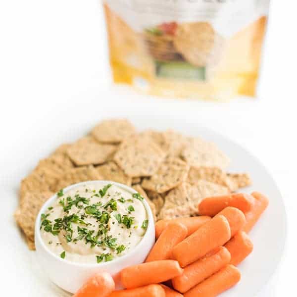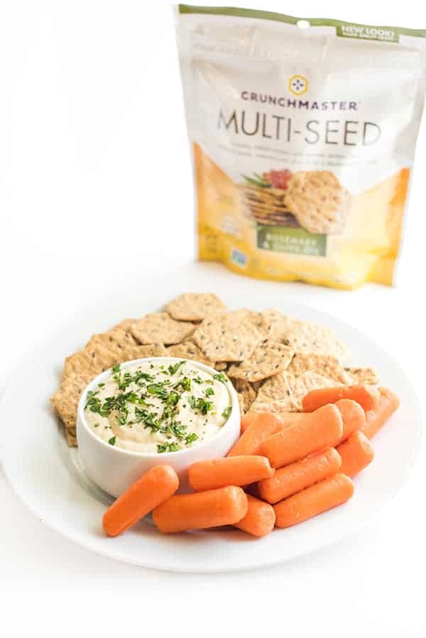 For added flavor, fragrant rosemary and fresh garlic are blended in along with lemon juice and olive oil. Cayenne gives it a nice kick but you’re welcome to leave that out to keep it completely mild. We love serving it with gluten free, whole grain Crunchmaster® crackers so that we can accommodate any guests with a gluten sensitivity.