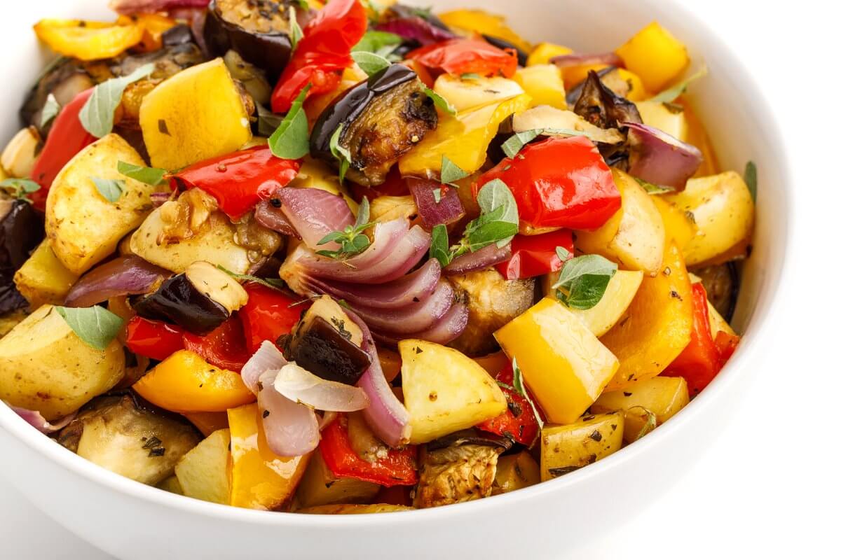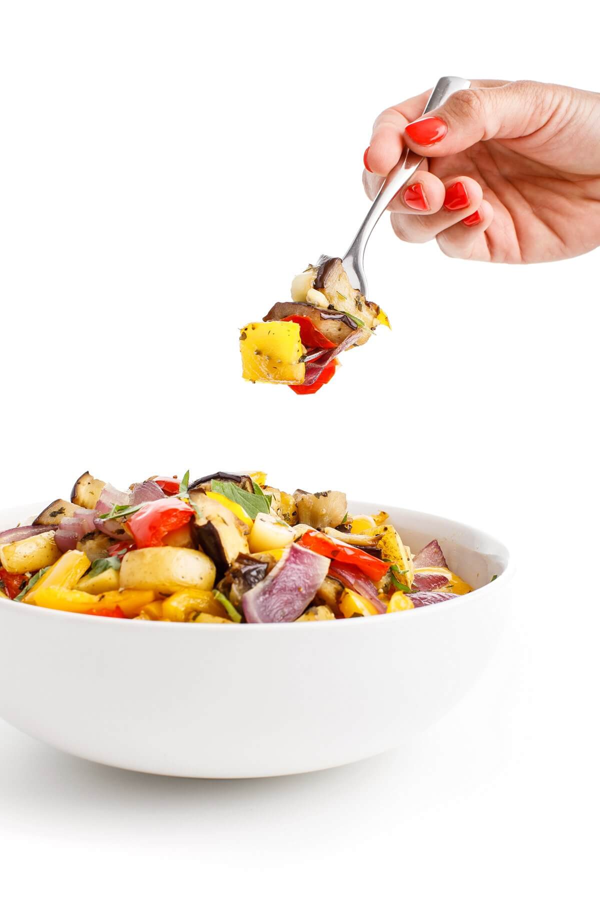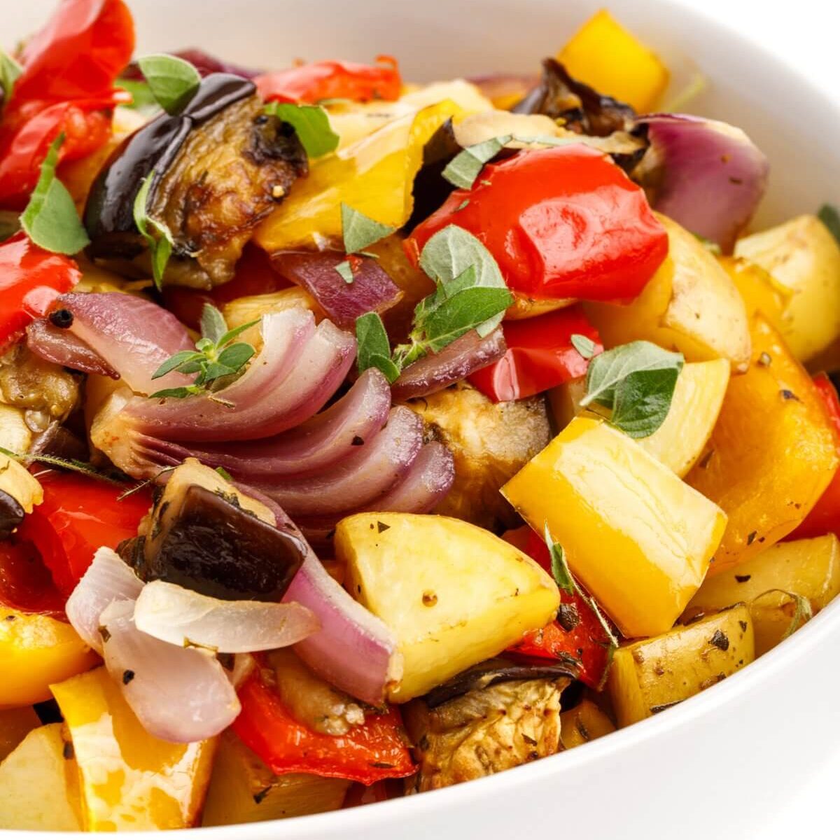 This quick and easy vegetarian side dish recipe is made with various veggies that are baked until caramelized in olive oil and fresh herbs.