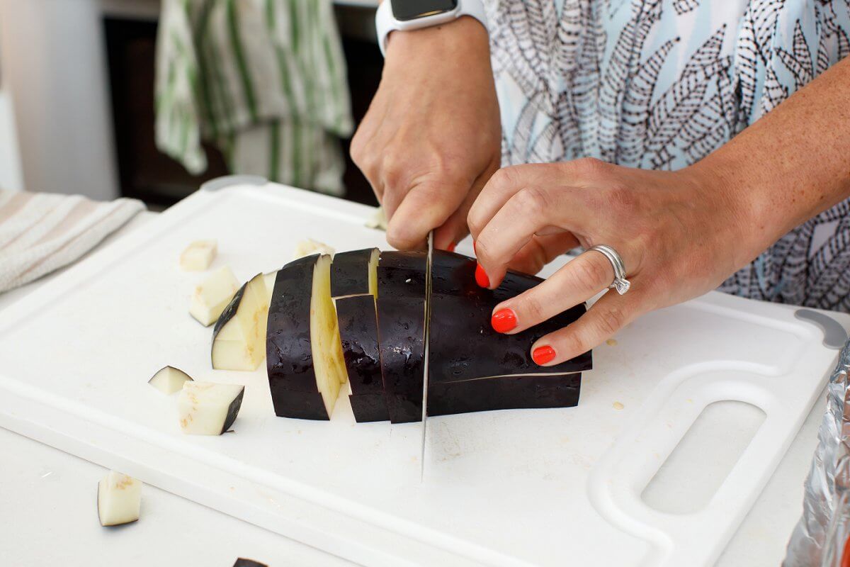 Then you’ll chop your eggplant, onion, and bell peppers to all be roughly the same size as the potatoes. The more uniform in size, the more even they’ll cook!