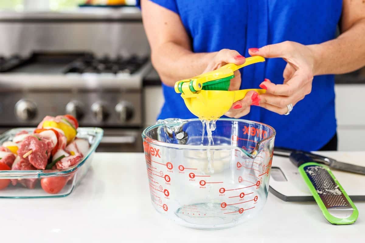 To create the marinade for your Greek Souvlaki Beef Kabobs, grab a large bowl and add your lemon juice.