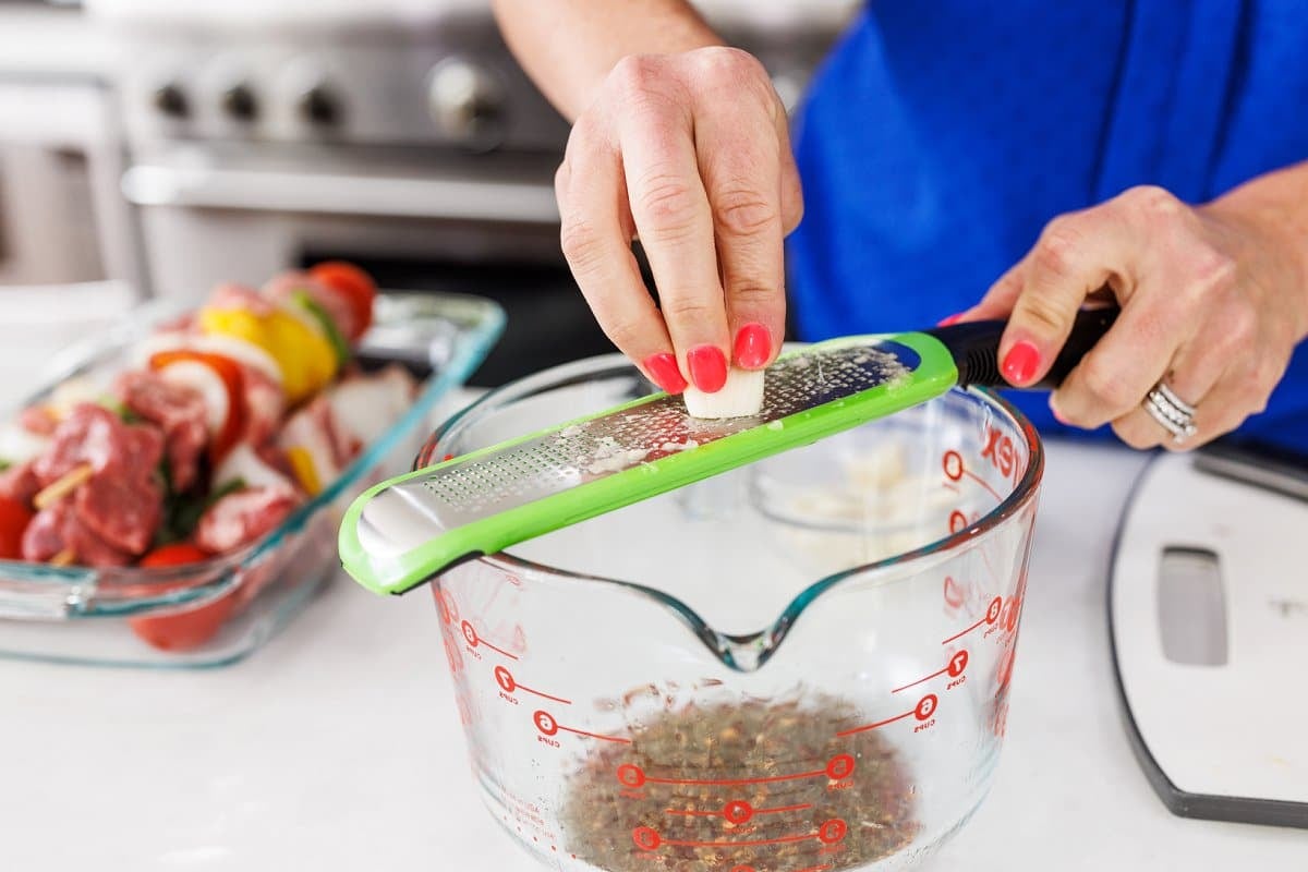 • Garlic: Freshly grated garlic is pungent and aromatic, and it sweetens up a bit as it cooks on your skewers.
