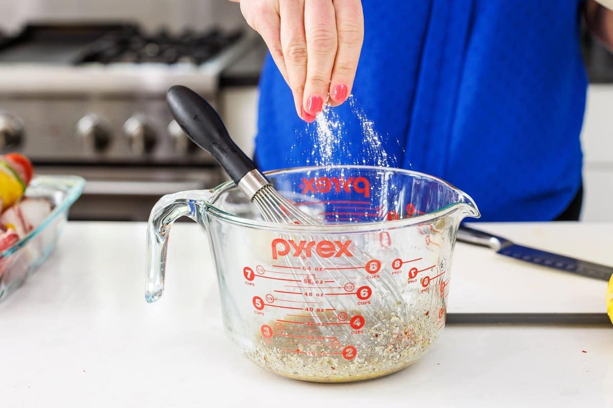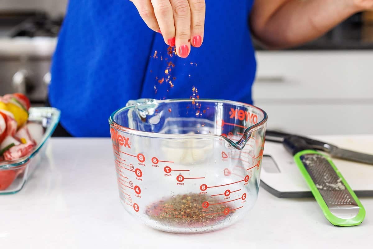 2. Whisk together marinade (olive oil through chili flakes) and drizzle over the beef kabobs.
