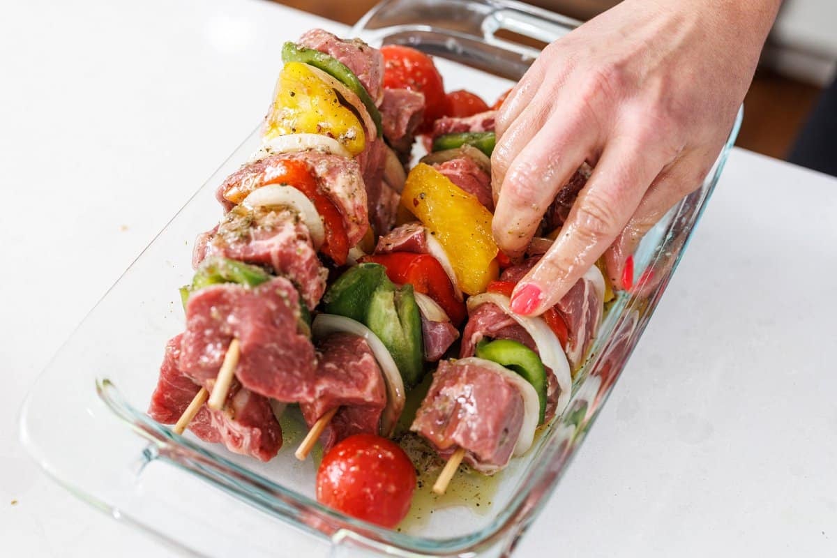 The meat section of the supermarket may have them pre-packed and already cut for you. If you’re not seeing pre-cut beef kabobs, bring your favorite cut of meat to the butcher’s counter and ask them to cut the meat down to 2-inch cubes. This will save you from having to cut the beef at home.
