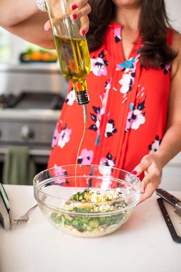 - Remove the veggies from the grill. Uesing a sharp knife, slice the corn into a large bowl. Next, slice the zucchini into bite-sized pieces and add to the bowl. Add all remaining ingredients to the bowl including feta, basil, scallions, lemon juice and remaining 2 tablespoons olive oil. Toss well and season with salt and pepper to taste before serving.