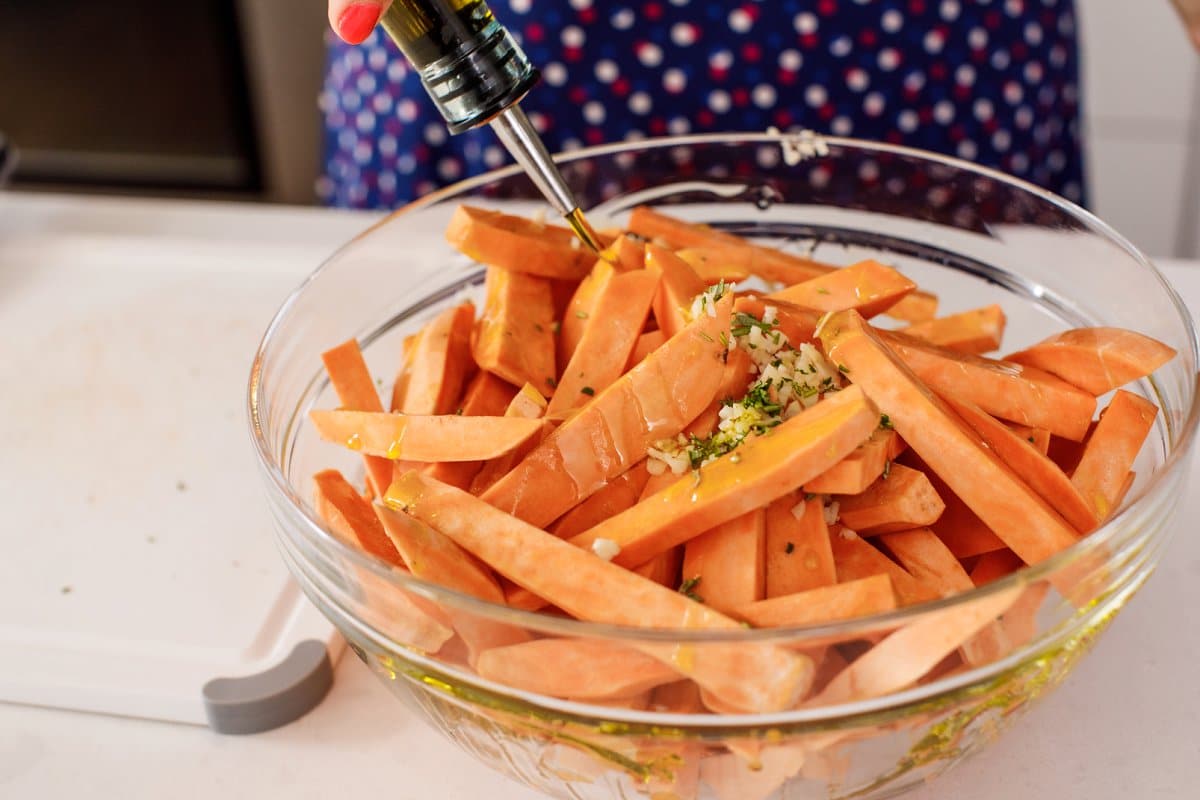 - In a large bowl, toss together all ingredients until sweet potatoes are evenly coated with oil and spices.