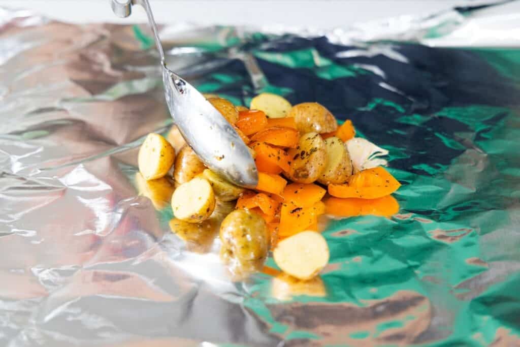 - Place the potatoes, peppers and garlic in a large bowl and toss well with olive oil, oregano, salt and chili flakes. Divide mixture evenly and place in the center of each packet.1 1/2 pounds Yukon gold potatoes, 2 red bell peppers, 12 cloves whole garlic, 1 teaspoon dried oregano, 1 teaspoon salt, 1/2 teaspoon red chili flakes, 2 tablespoons extra virgin olive oil