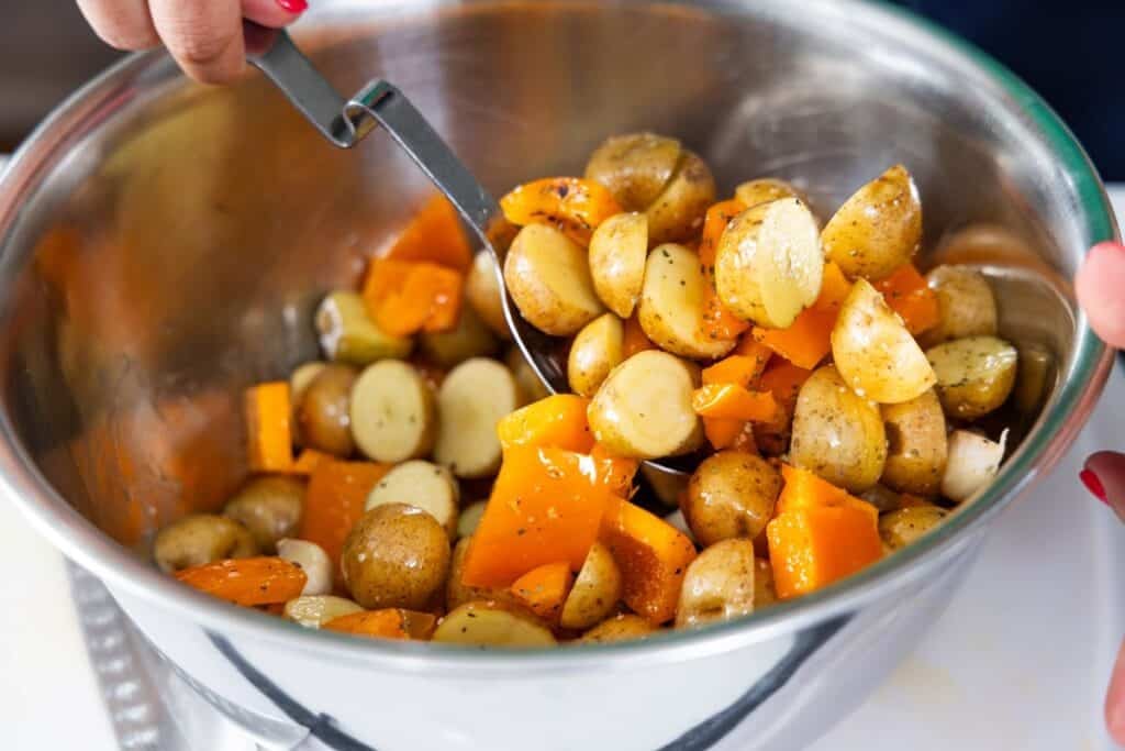 Step 3. In a large bowl, toss the potatoes, peppers, and garlic in some olive oil, salt, pepper, oregano, and red chili flakes.