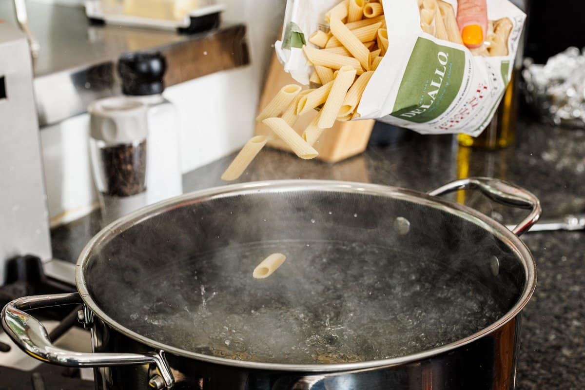 Next bring a pot of salted water to a boil, and cook your pasta according to package instructions.