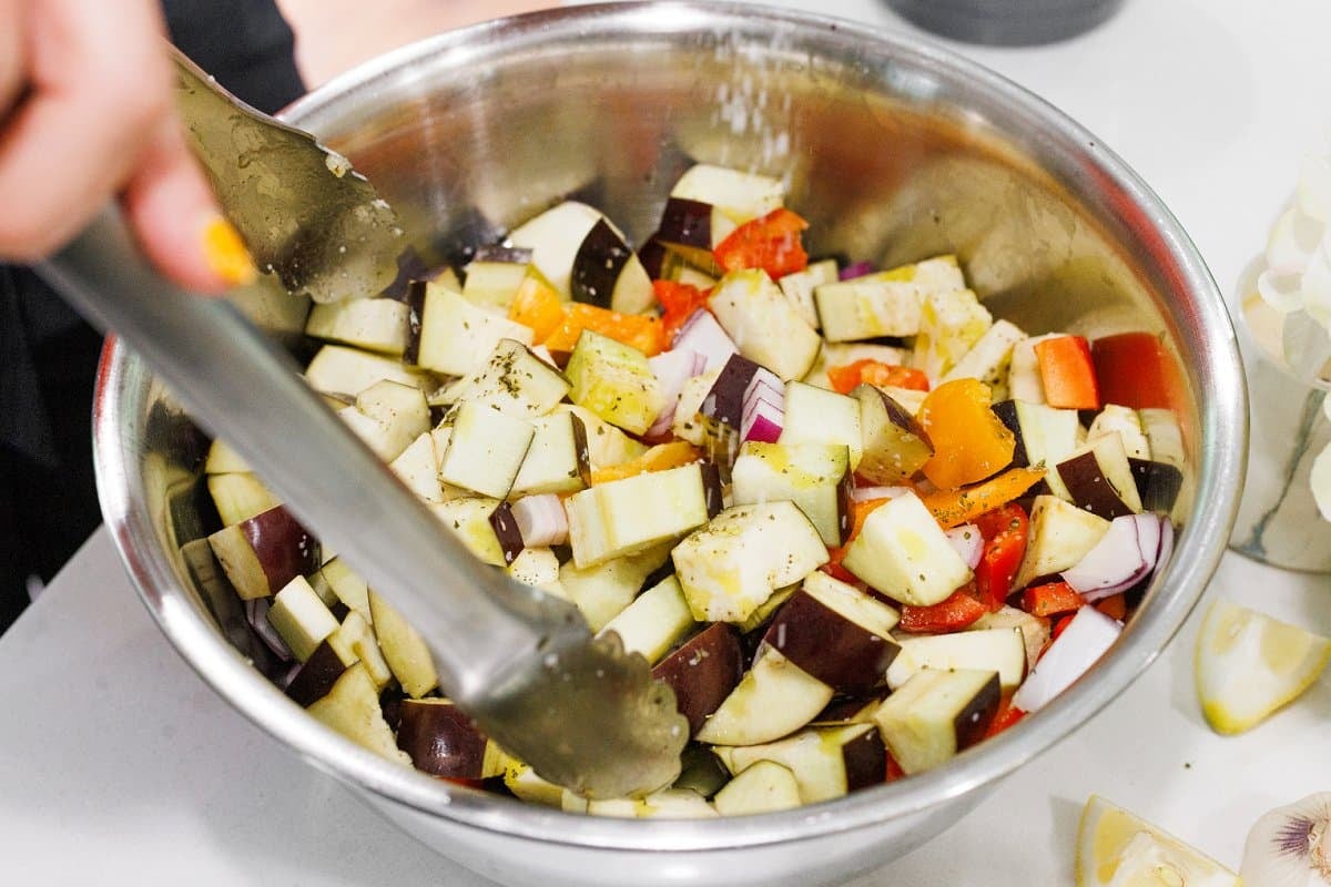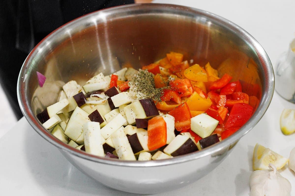 Then in a large bowl, add the eggplant, onion, and peppers and season with salt, black pepper, and the oregano.