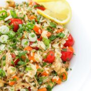 Delicious warm, cold or room temperature, this Lebanese rice salad is made with fresh herbs and crunchy veggies then tossed in a lemon garlic vinaigrette.