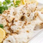 White fish with tahini sauce, a healthy Lebanese recipe.
