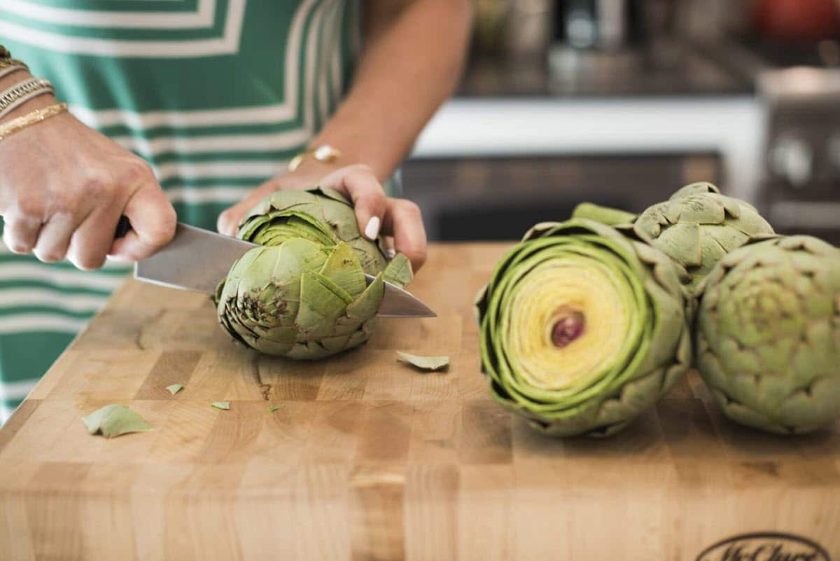 First you’ll cut the tops off of your artichokes, about 1 inch down. None of the meat is on this part, so go ahead and toss them.
