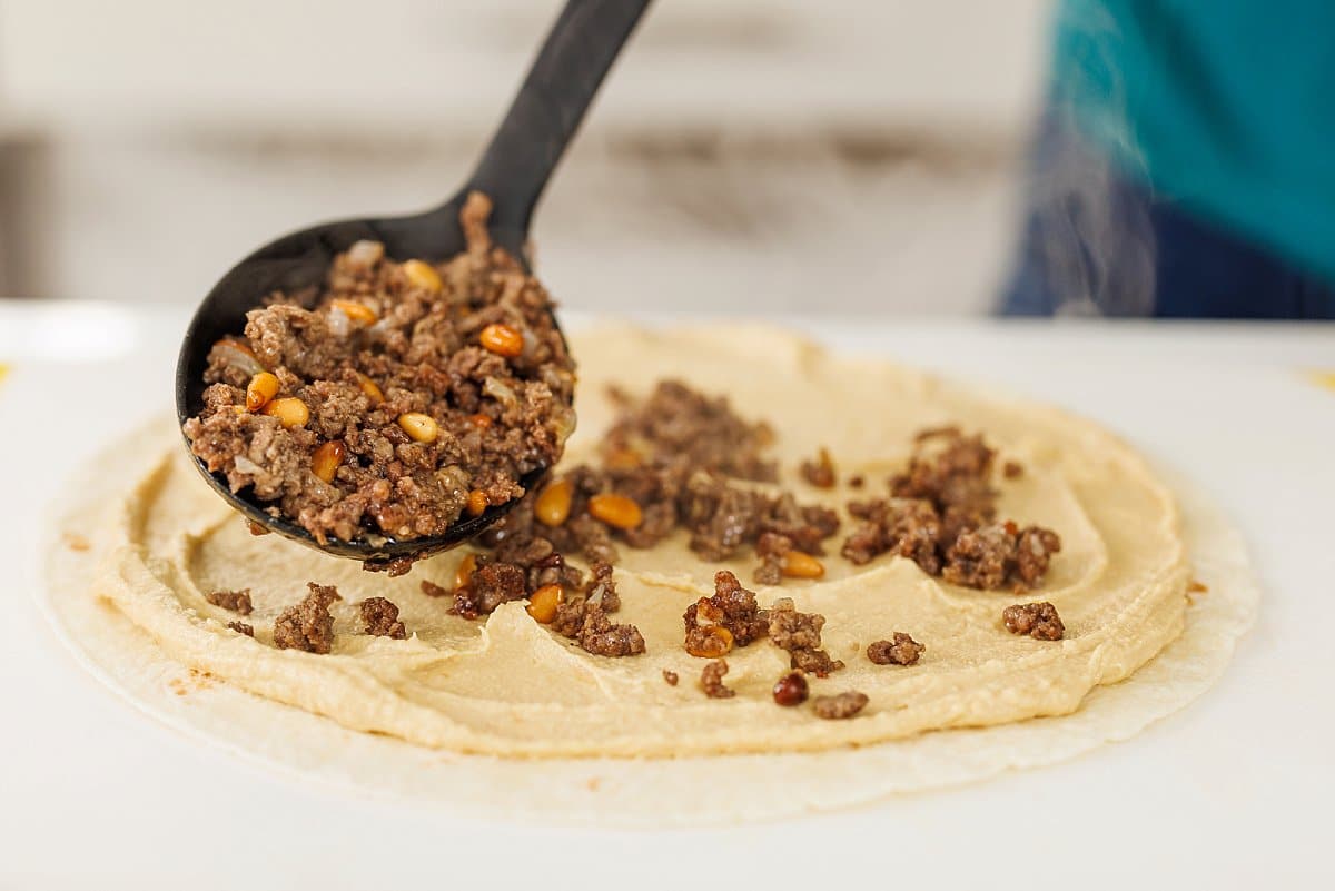 Hummus is spread on a flour tortilla and topped with hushwee (meat and pine nut mixture), tomatoes, and feta then wrapped tightly and sliced. These flavor-packed hummus and hushwee pinwheels are perfect for stashing in lunchboxes or serving as a party appetizer or after-school snack.