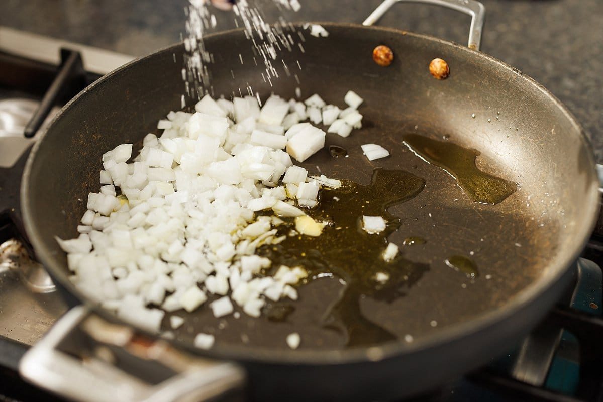 Cook diced onions in the melted ghee until softened.