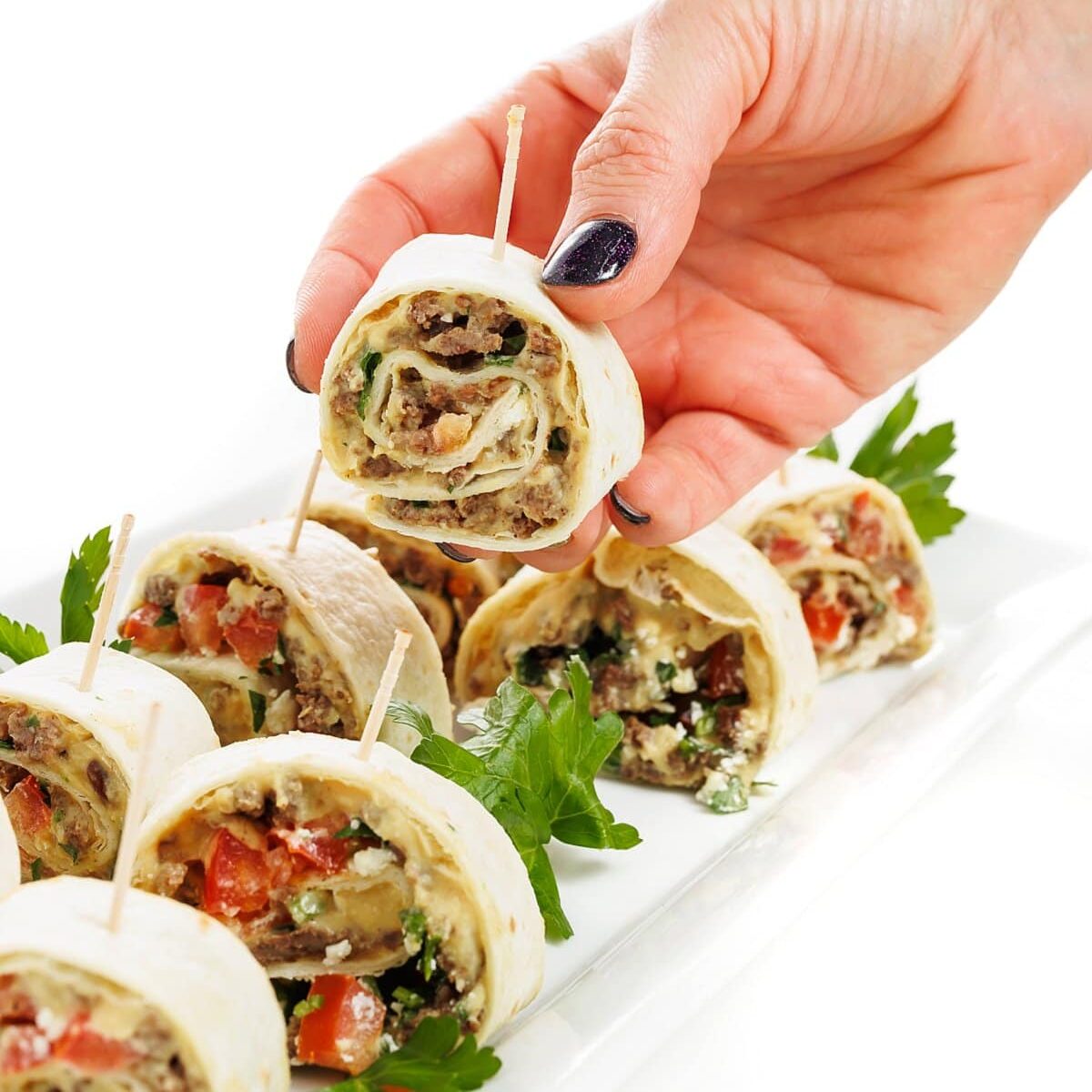 - Similar to wrapping a burrito, begin very slowly and carefully rolling the tortilla in to one long log. Don't be afraid to tighten as you wrap, this will help keep the pinwheels in place. Once wrapped, use a sharp knife to slice in to 1-inch pinwheels. Secure with one or two toothpicks then place on a platter to serve.