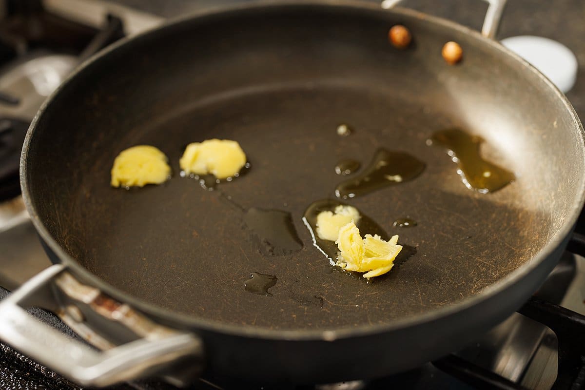 Start your Hummus and Hushwee Pinwheels by making Lebanese hashweh. Heat up ghee in a pan over medium high heat.