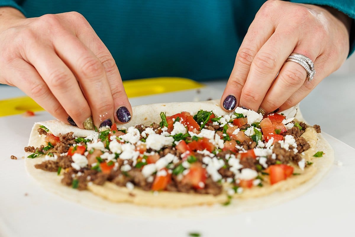 Then slowly roll up the tortilla, like you would a burrito, until it’s an even shaped log. Slice evenly into one inch pieces, using one or two toothpicks to keep pinwheels secure.
