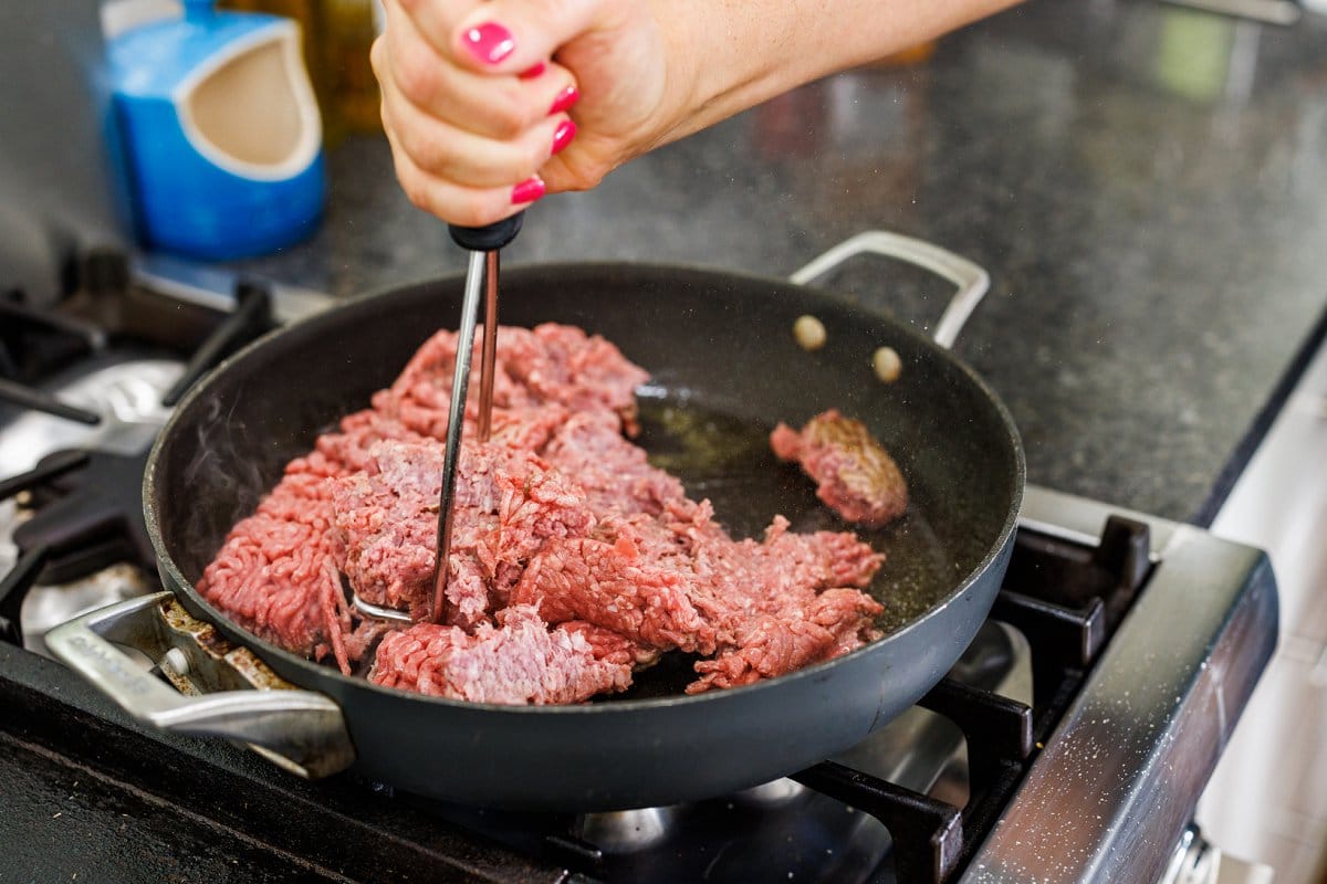 Then add the Certified Angus Beef® ground sirloin to the pan, make sure you break it up as it cooks.