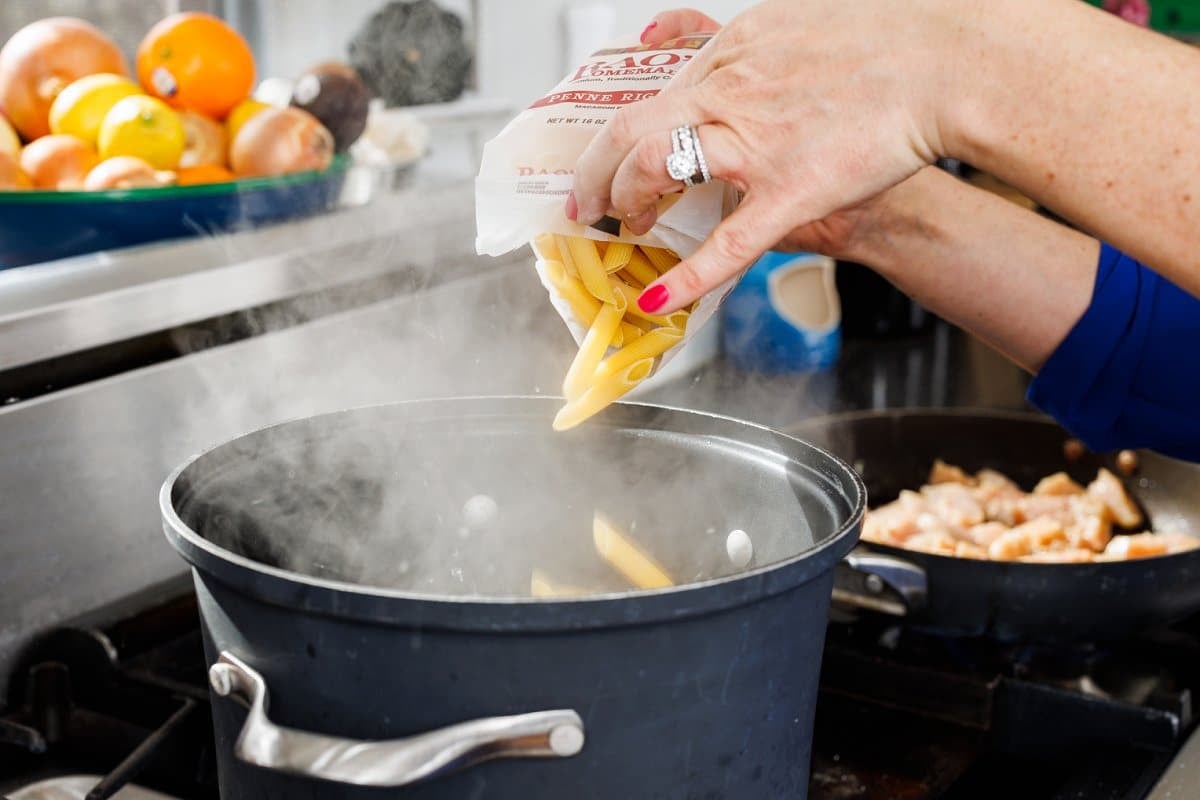 Bring a large pot of salted water to a boil and add your pasta. Cook according to package instructions before draining and setting aside, reserving about a cup of the water.