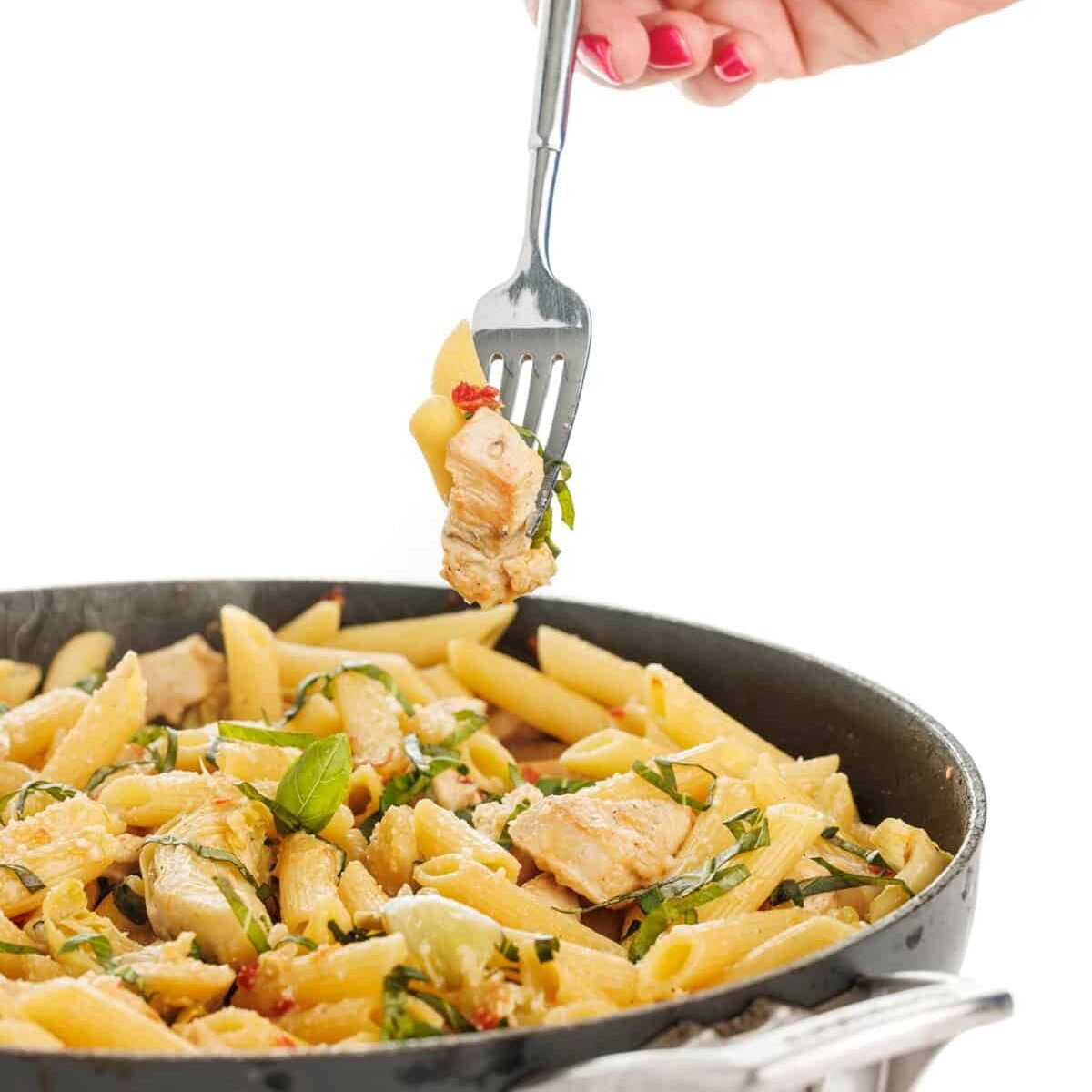This easy and delicious Italian chicken pasta recipe is filled with large chunks of chicken, tender artichoke hearts, and sun-dried tomatoes.