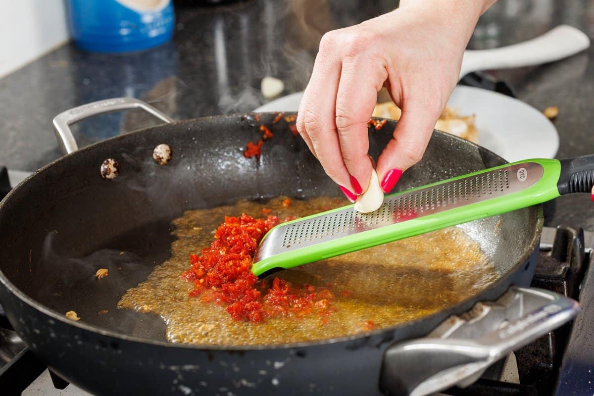 And using a microplane, add the garlic. Coo for about 30 seconds.