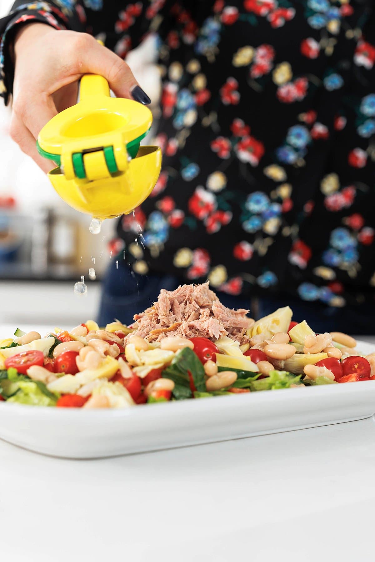 This light and refreshing Italian chopped salad with cannellini beans, tuna, and artichokes is bursting with flavor and packed with protein to give you energy all afternoon long.