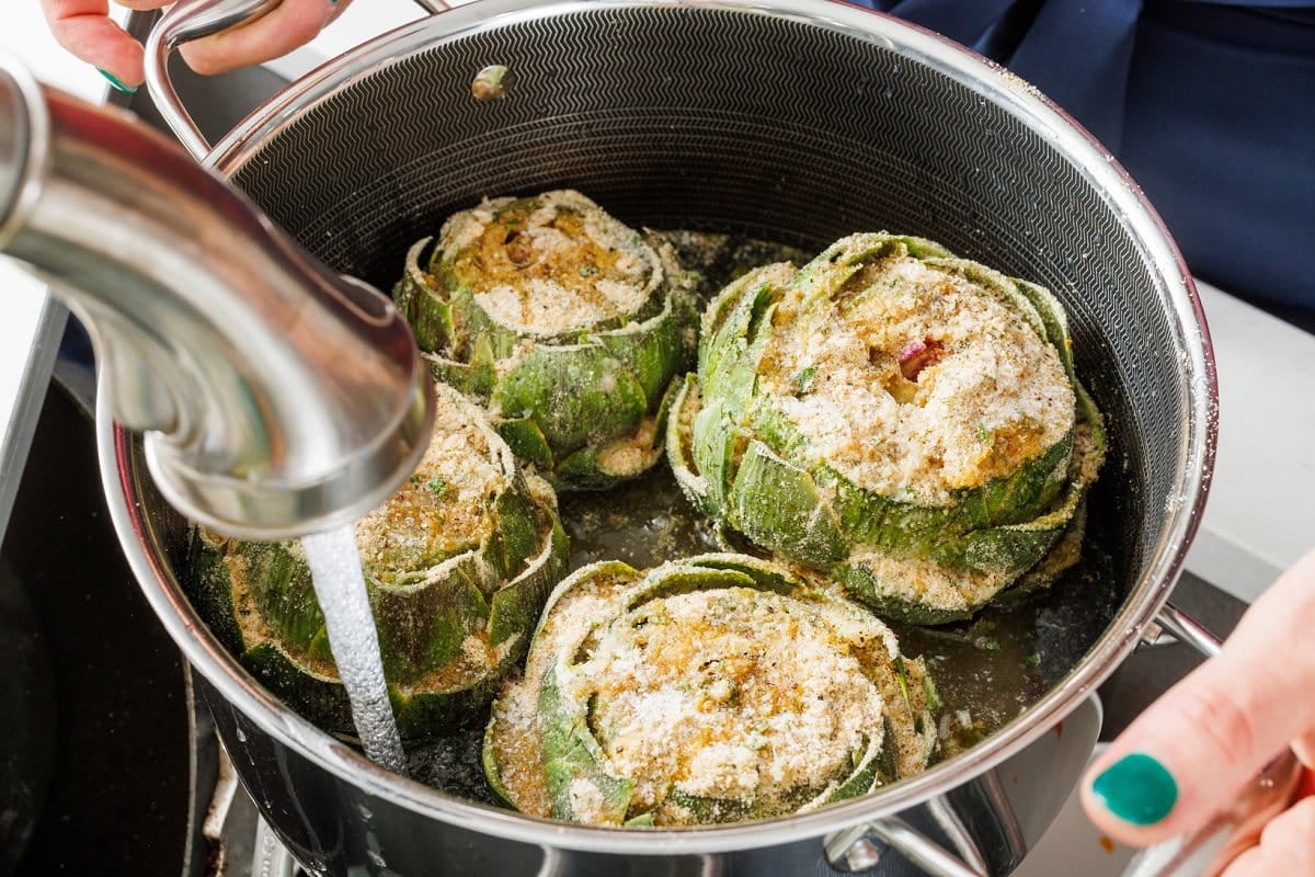 Put the stuffed artichokes in a large pot standing up, then fill with water to just under the outer leaf layer.. Bring to a boil, then cover with a lid and reduce heat and simmer for about 45 minutes or until leaves feel tender.