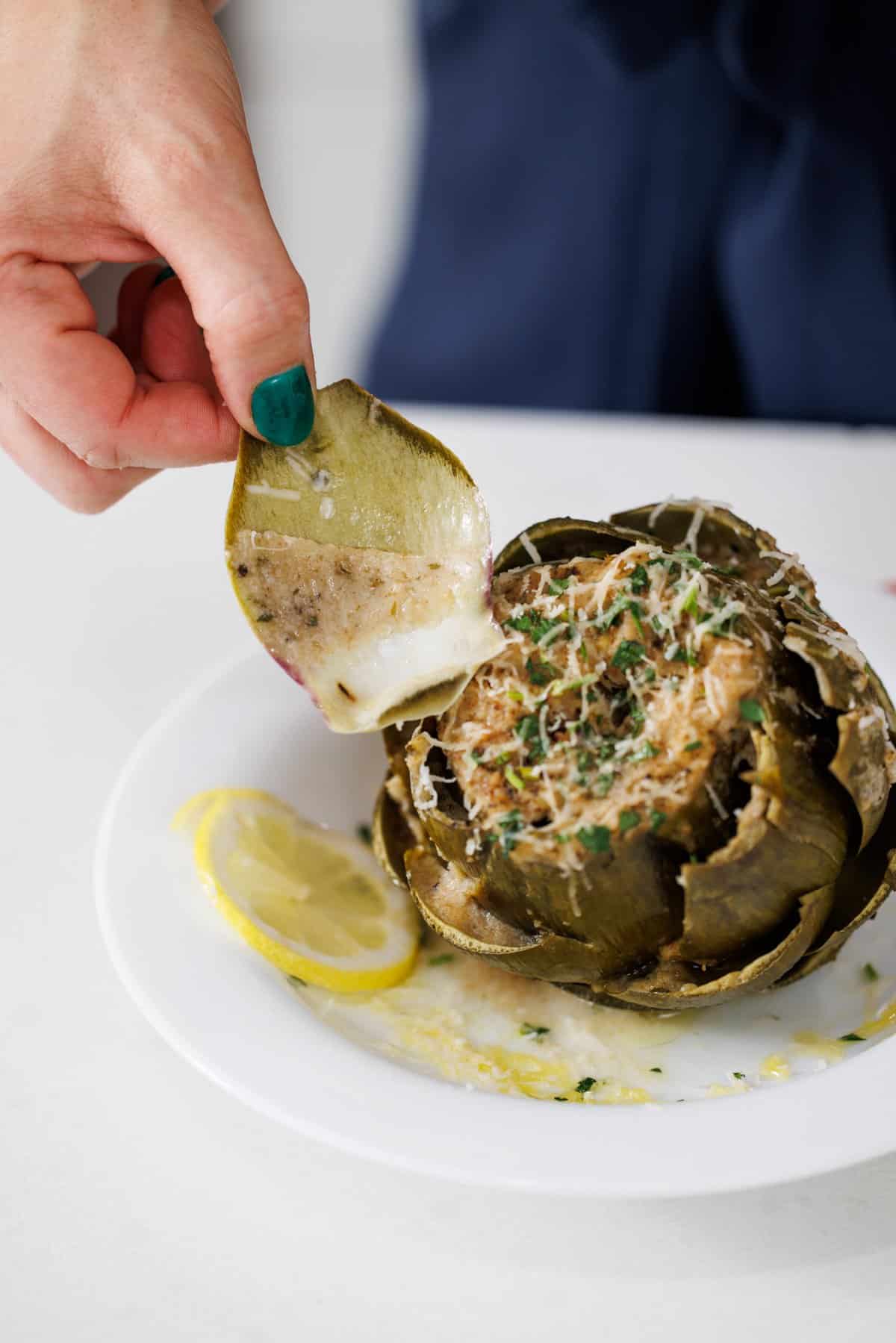 Tonight was my third time using your fantastic recipe. The last two times I substituted avocado oil for olive oil. So so good. Although I make just two (it’s just me), I end up using the same amount of stuffing that is called for in the six serving recipe because I remove the middle leaves and prickly part, so I can shove more stuffing inside the middle.