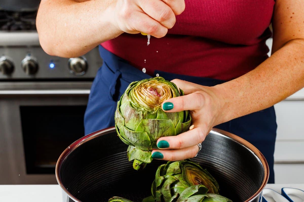 Then take your fresh lemon juice and squeeze it over the top of each artichoke.
