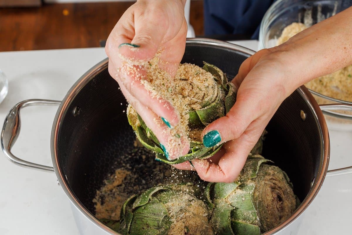 6. In a large bowl, mix together the bread crumbs, grated cheese, parsley, garlic, salt, and pepper. Fill each leaf with the stuffing until artichokes are well packed.