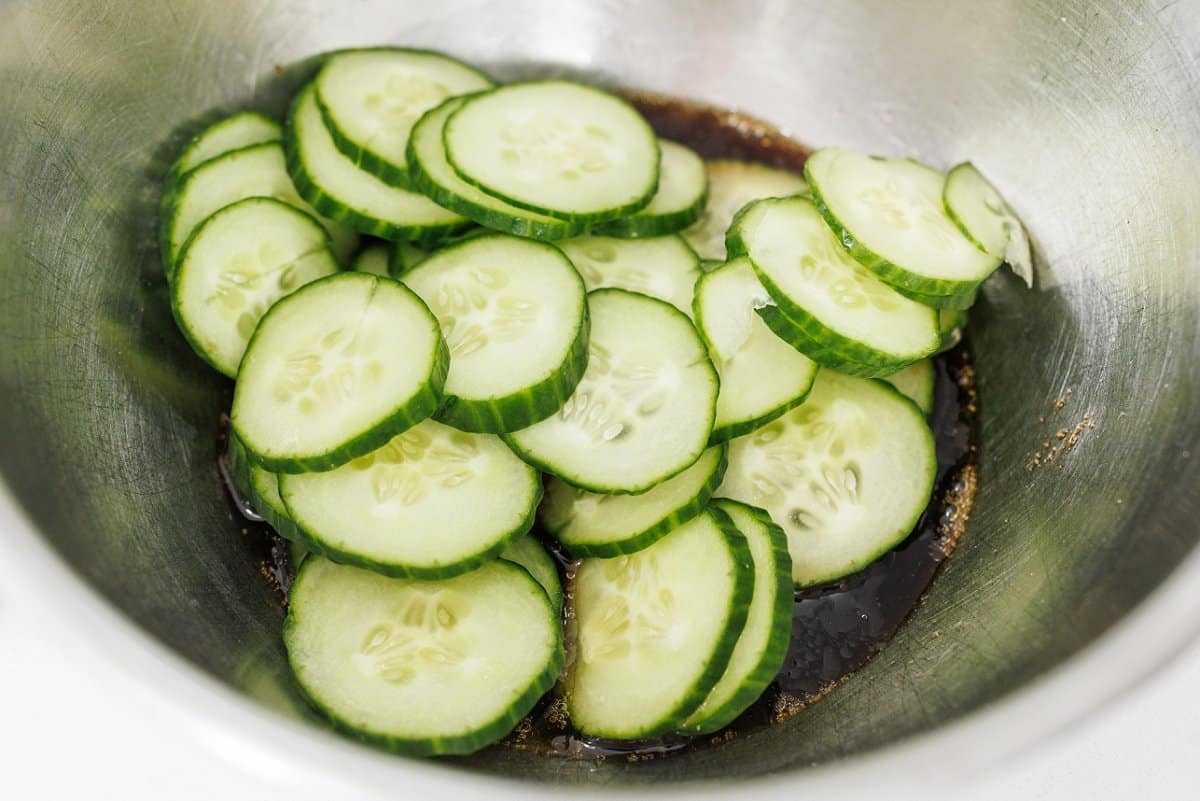 Then take your slices of cucumber and add them to the bowl with the pickling mixture.