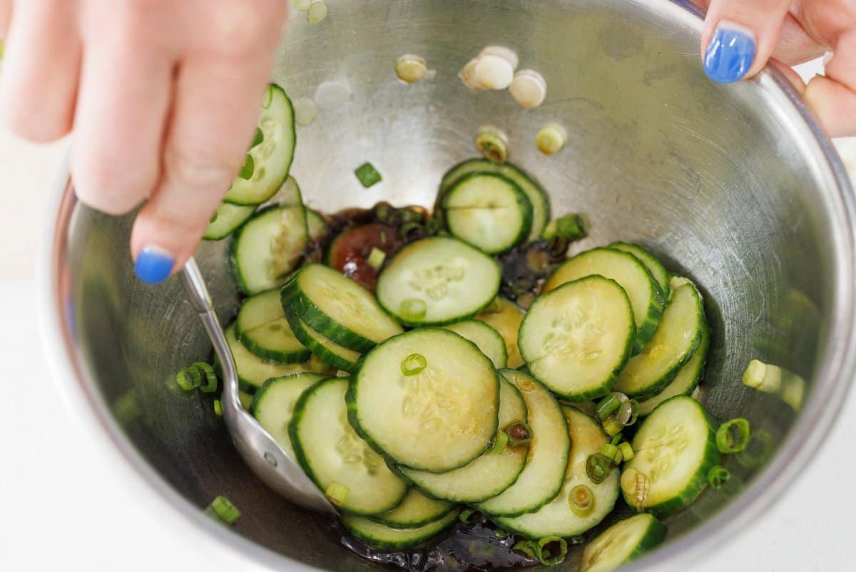 2. Add cucumbers and scallions to bowl and toss well. Let sit at room temperature for 15 minutes or longer before serving.