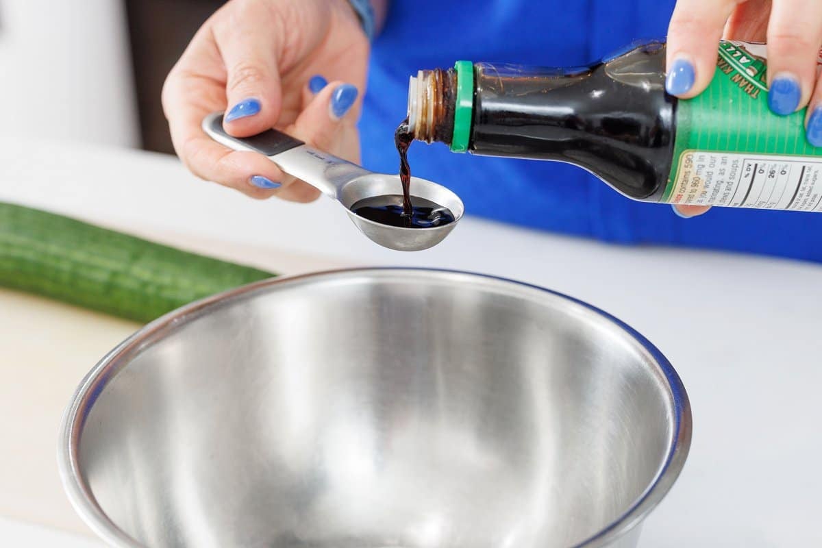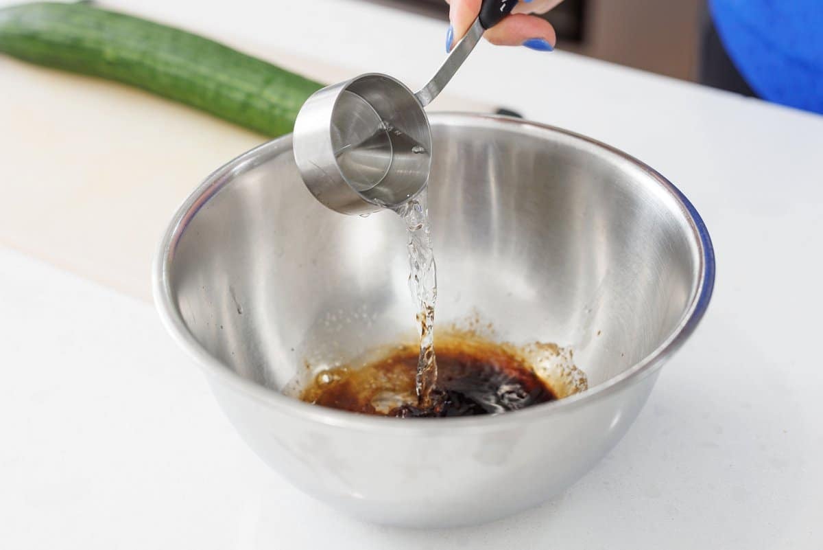 Then add the rice vinegar, and if you’re a fan of spicy, you could also add some chili paste or red pepper flakes.