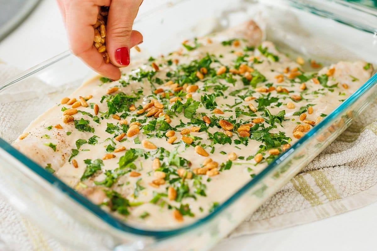 - While fish is baking, toast pine nuts in a dry pan on the stove or in the oven for 5-6 minutes. Garnish fish with toasted pine nuts and parsley to serve.1/4 cup toasted pine nuts, 1/4 cup minced parsley
