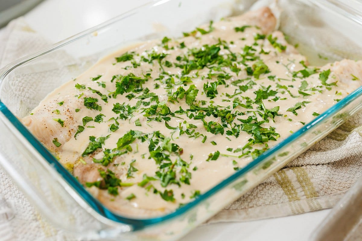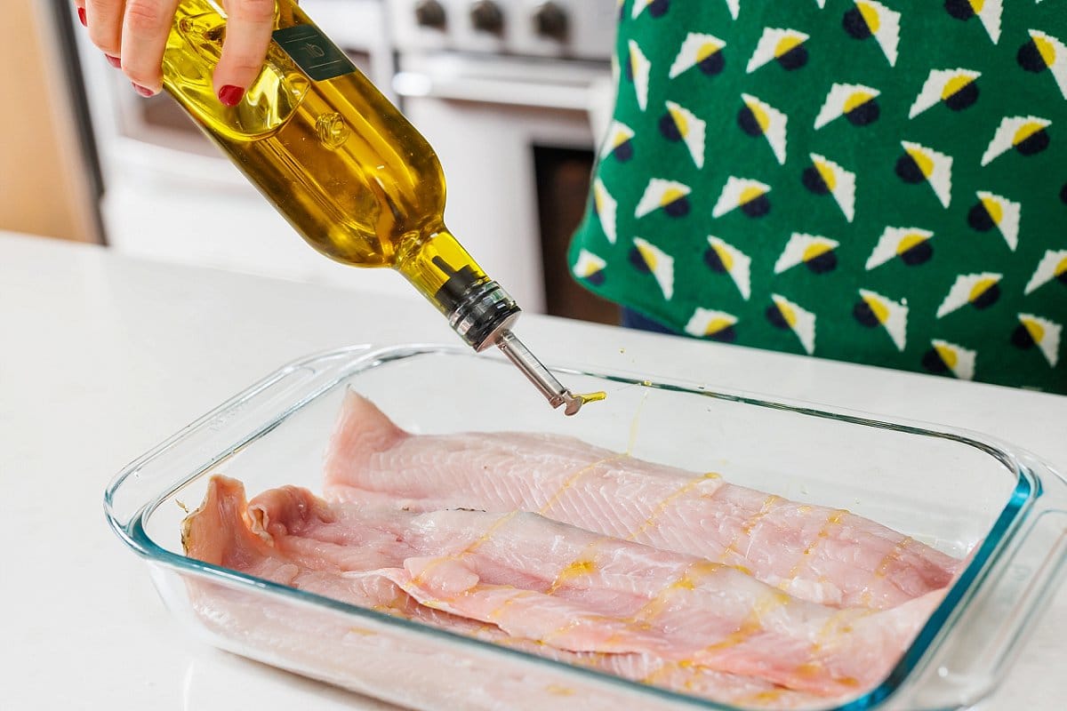 Start by cooking your fish. Pat them dry, and lay the fillets in a flat layer in a prepared baking dish.