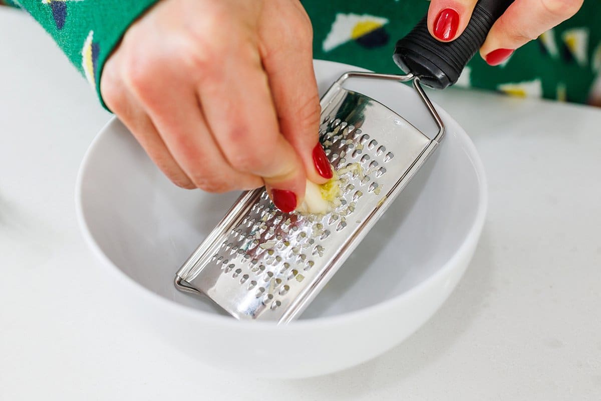 While the fish is baking, make your tahini sauce. Start by freshly grating your garlic into a small bowl.