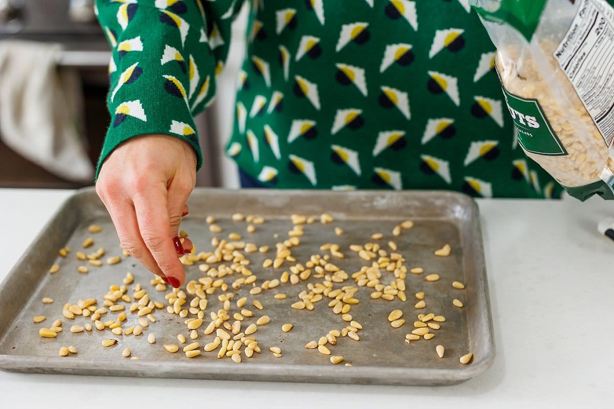 While the oven is warm, roast the pine nuts on the second rack for 6-8 minutes.