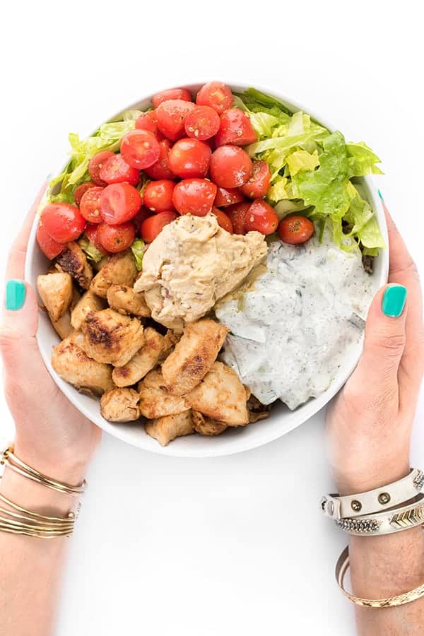 - To assemble, fill each bowl with two cups of romaine and a half cup of cooked grains (if using.) Top with one serving each of the chicken and cucumber Laban. Finally, top with two tablespoons of hummus and 1/4 cup of the tomato mixture. Serve with extra lemons for squeezing before eating!
