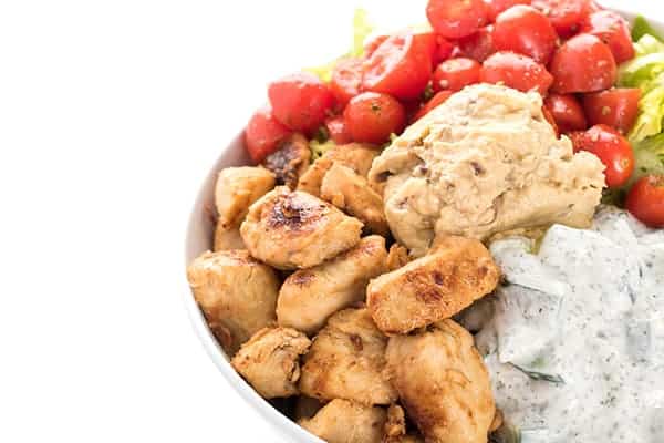 This hearty Lebanese-inspired protein bowl is packed with lemony chicken tawook, creamy cucumber yogurt sauce and hummus.