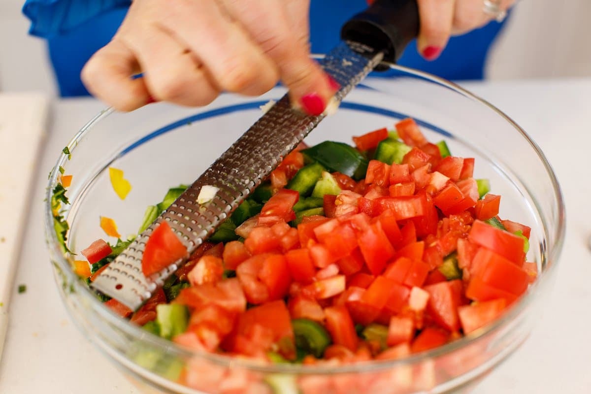 While you can make the vinaigrette dressing in a separate bowl, I like to make it right on top. So take a microplane and grate your garlic cloves.
