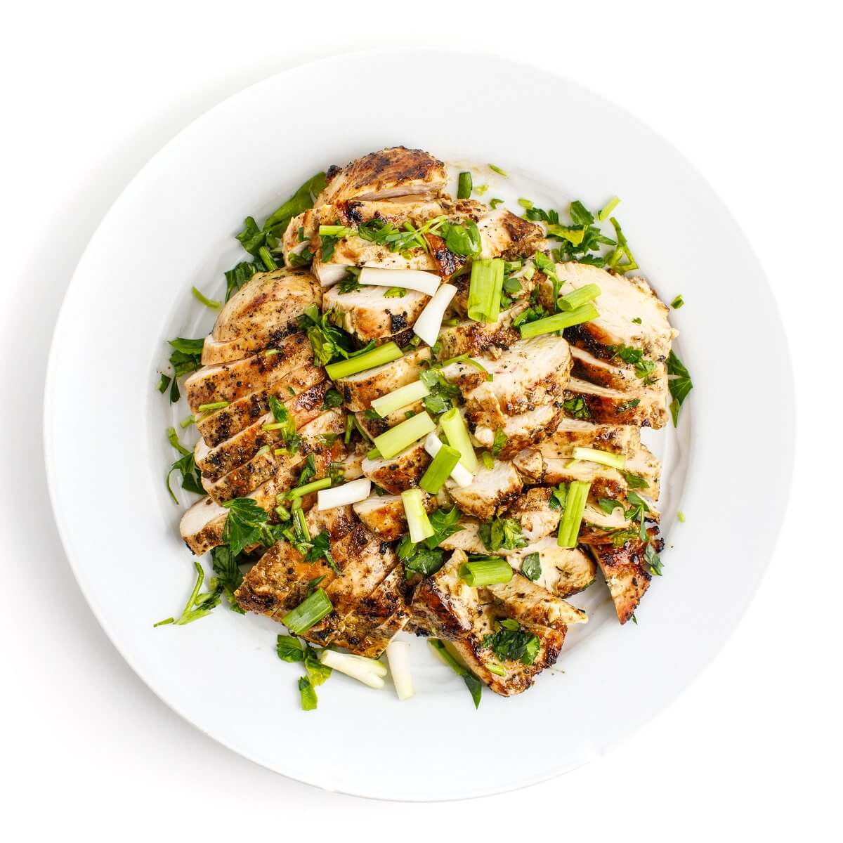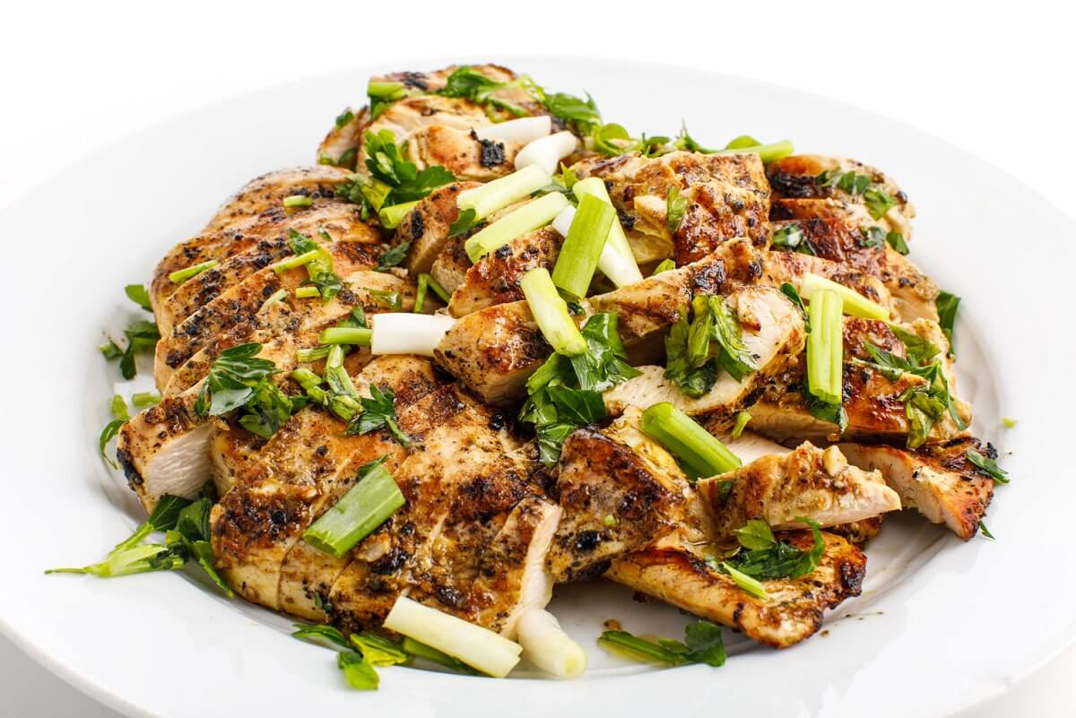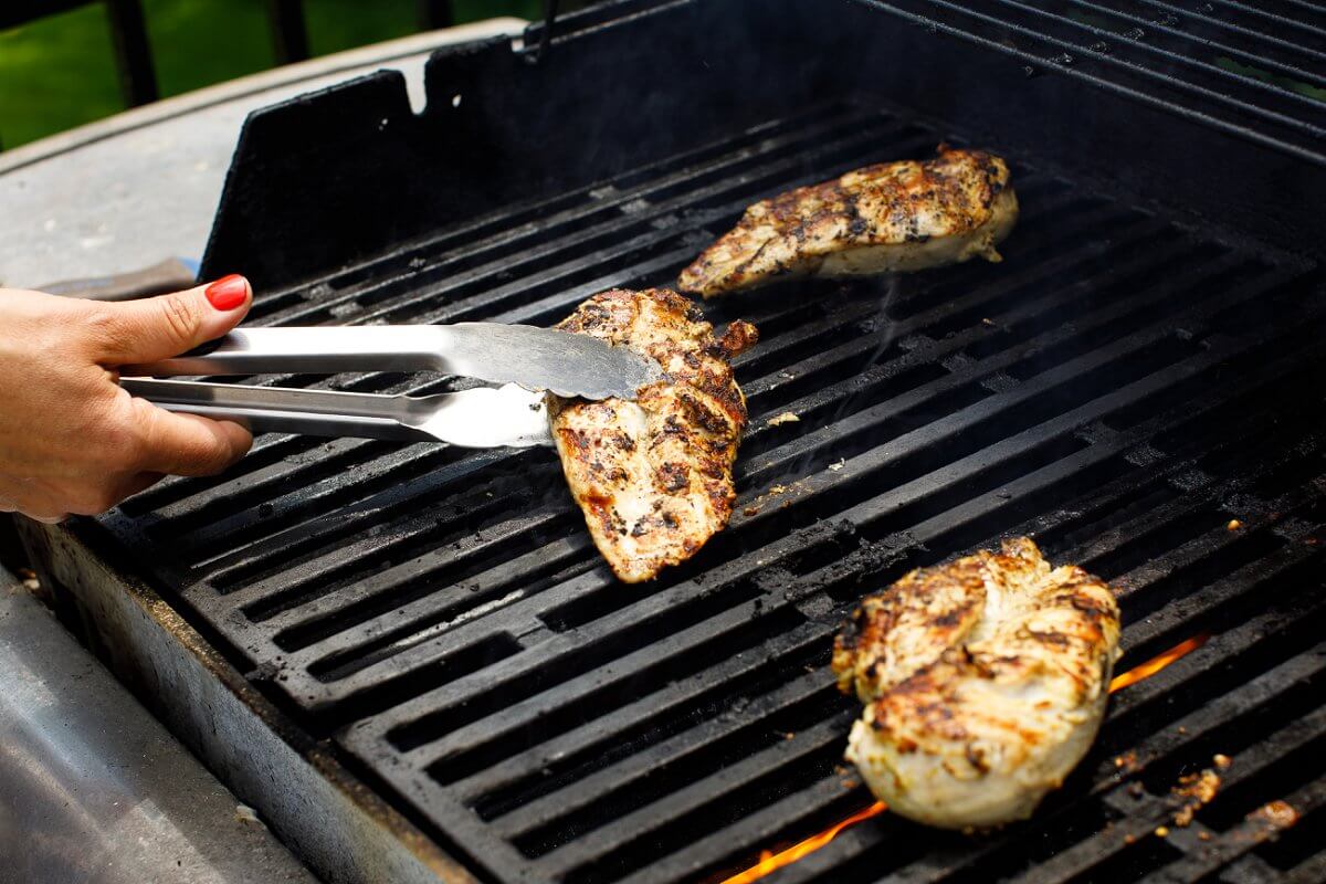 Grill chicken breasts for around 9 to 10 minutes total, flipping halfway through. Once the internal temp is 165°F, remove from grill and let cool at least 10 minutes before slicing to allow juices to redistribute.