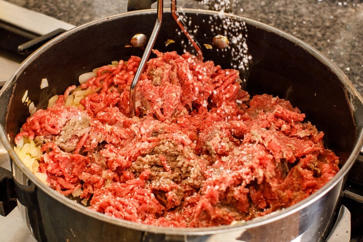 Add your ground beef and season with some salt and pepper, breaking up with a wooden spoon or potato masher.