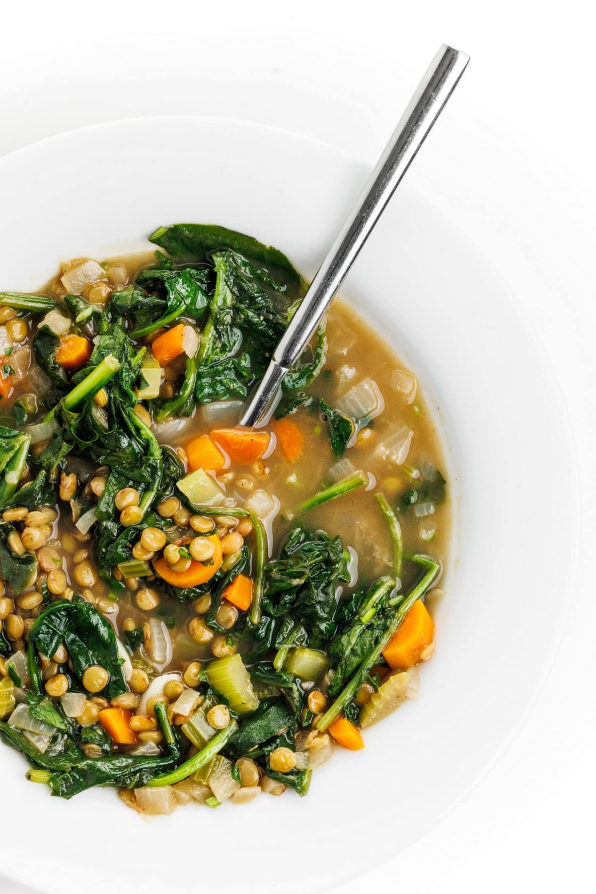 Spoonful of Lebanese lentil soup with greens.