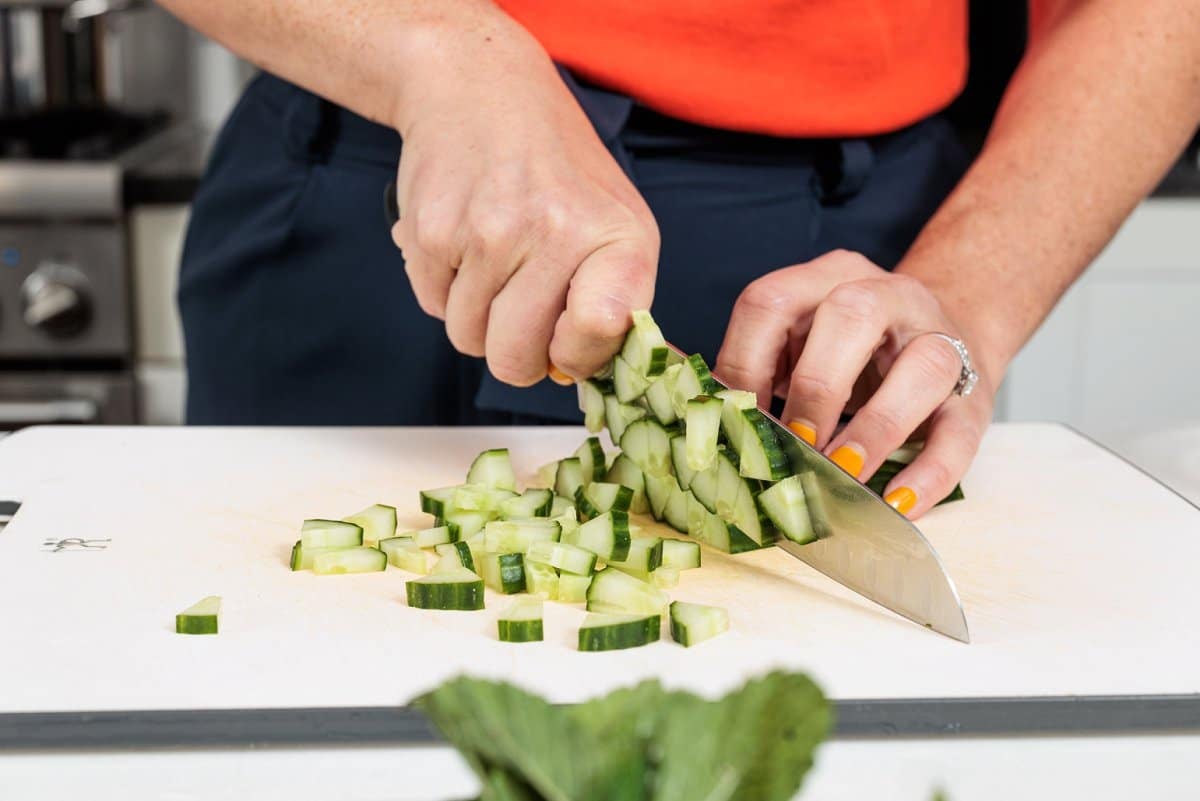 Wash your cucumber and tomato, then dice and add to a large bowl.