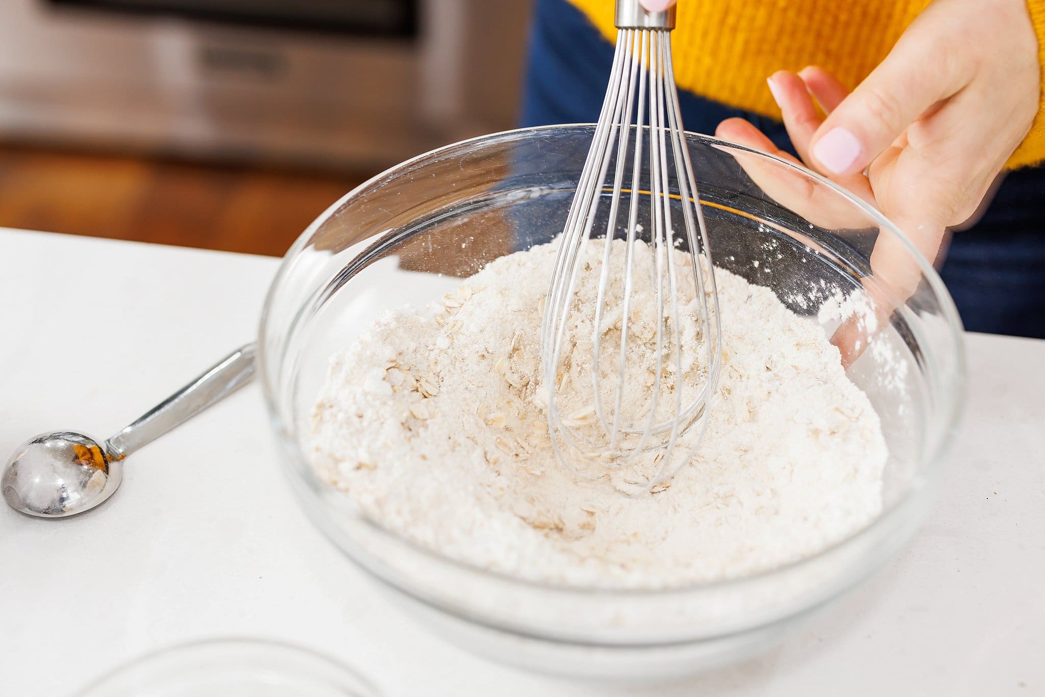Finish with the whole wheat flour, baking powder, and salt. Give it a good whisking until it’s evenly mixed.