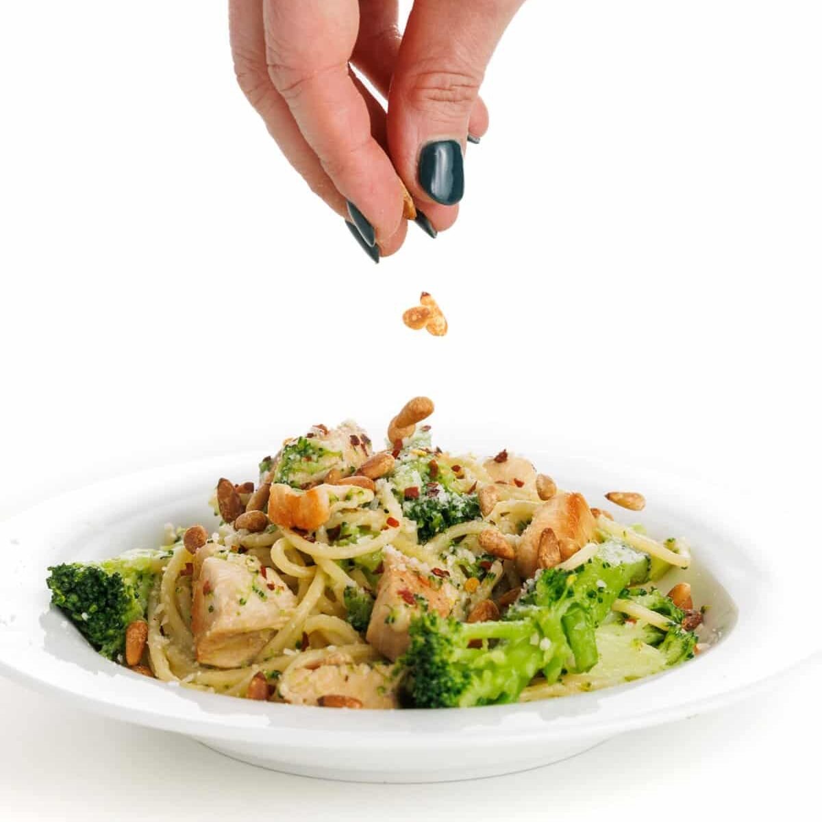 Serve garnished with toasted pine nuts and fresh basil, and enjoy your Lemon Pasta with Chicken and Broccoli!