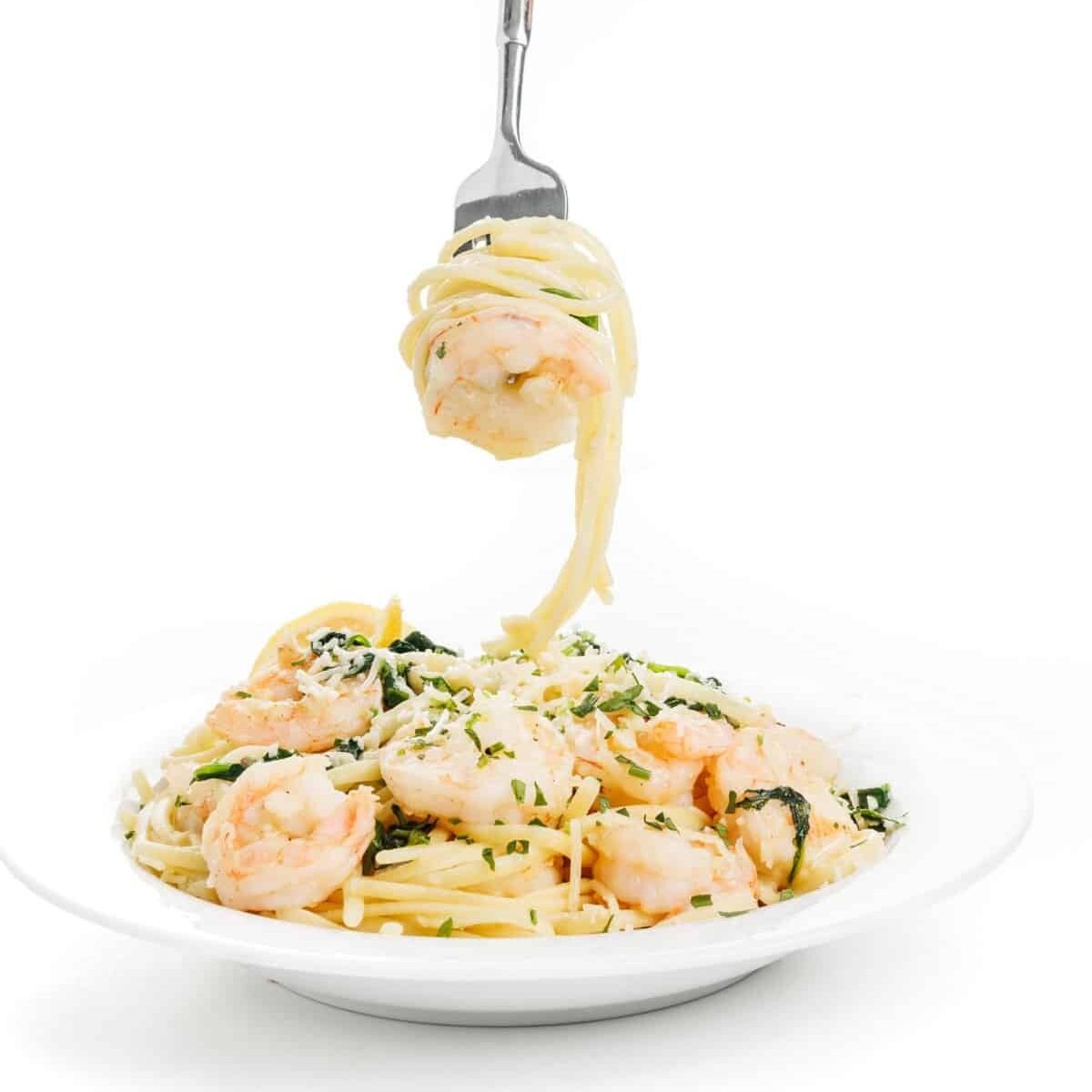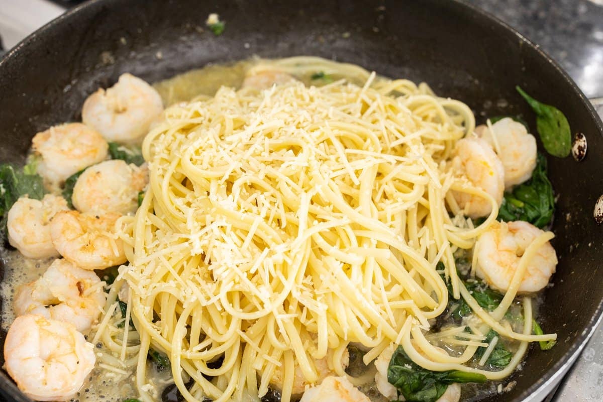 I love to use linguine, and believe it’s a pretty popular choice because the flatter noodles coat easily in the oils and flavors of seafood.