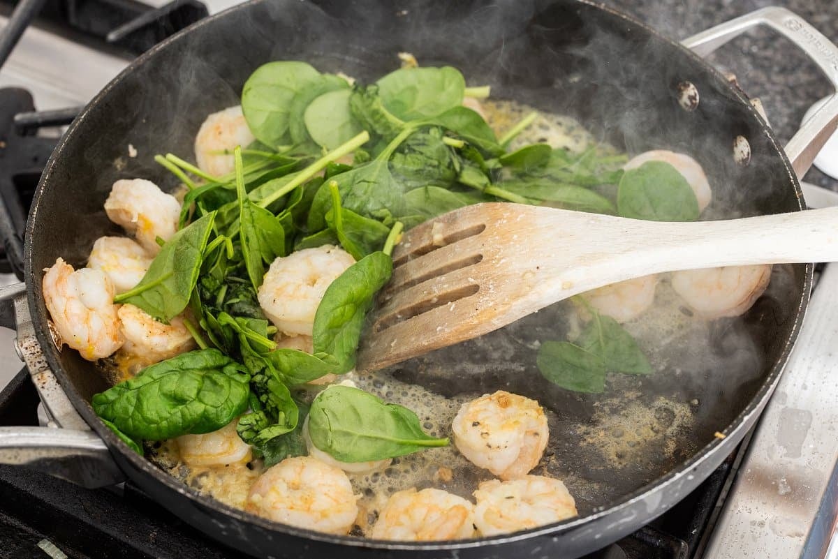3. Add garlic to the shrimp and sauté until fragrant, about 30 seconds, being careful not to burn. Stir in lemon juice, lemon zest and spinach/arugula blend. Sauté until greens start to wilt, about 2 minutes.